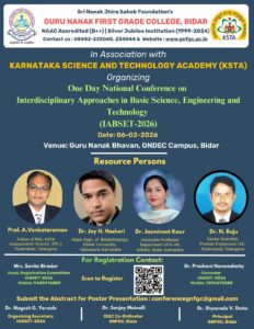 One Day National Conference on Interdisciplinary Approaches in Basic Science, Engineering and Technology [IABSET – 2026] @ Guru Nanak Bhavan, GNDEC Capus, Bidar Calendar Add to Calendar Add to Timely Calendar Add to Google Add to Outlook Add to Apple Calendar Add to other calendar Export to XML When: ಫೆಬ್ರವರಿ 6, 2026 @ 10:00 ಫೂರ್ವಾಹ್ನ – 5:30 ಅಪರಾಹ್ನ 2026-02-06T10:00:00+00:00 2026-02-06T17:30:00+00:00 Where: Guru Nanak Bhavan, GNDEC Capus, Bidar Continue Reading Previous World Wet Land DayNext Two-Day Special Lecture Series on “Science and Technology for Sustainable Future”